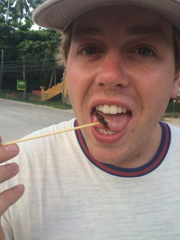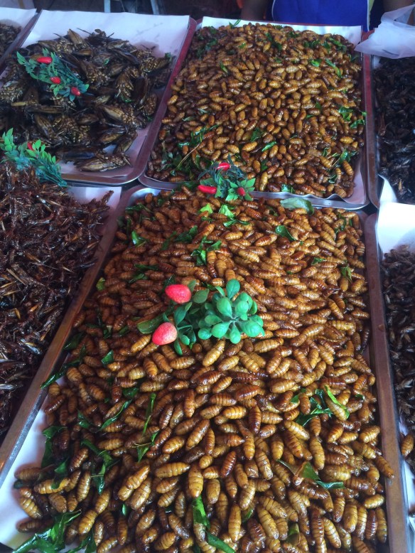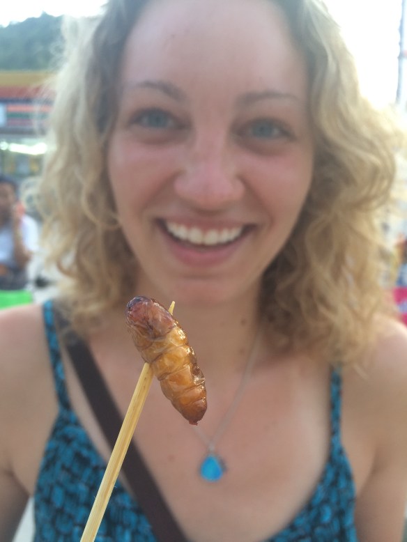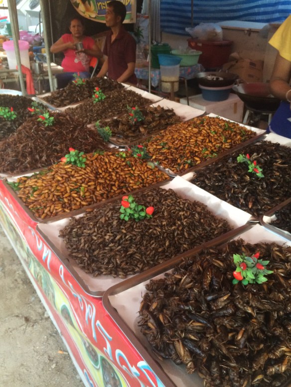 We spent 20 TBH (20 Baht: 60 cents USD) on a little baggy of cooked grasshoppers and larva. To my surprise.. But not really.. Mike forced me into trying one, insisting “it tastes like chicken!”